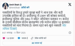नक्सलियों के विरुद्ध हमारे सुरक्षा बलों ने आज एक और बड़ी उपलब्धि हासिल की है। छत्तीसगढ़ में CRPF की कोबरा कमांडो, छत्तीसगढ़ पुलिस और DRG ने जॉइंट ऑपरेशन चलाकर ₹1 करोड़ के इनामी सीसीएम मोडेम बालकृष्णा उर्फ मनोज सहित 10 कुख्यात नक्सलियों को मारा गिराया है। समय रहते बचे-खुचे नक्सली…