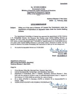 सरकार की ओर से सोशल मीडिया प्लेटफॉर्म X पर साझा पोस्ट के मुताबिक 8वें केंद्रीय वेतन आयोग में आईआरएएस 2009 बैच के श्री कृष्णा वी. आर. को निदेशक पद पर प्रतिनियुक्ति आधार पर नियुक्त किया गया है। यह नियुक्ति कार्मिक, लोक शिकायत एवं पेंशन मंत्रालय के तहत कैबिनेट की नियुक्ति समिति की स्वीकृति से की गई है।