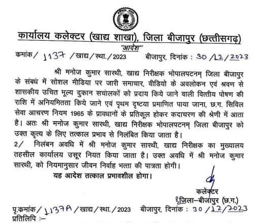 बीजापुर। राशन दुकानों की वित्तीय पोषण राशि मे सेंधमारी मामले में जांच सही पाए जाने पर भोपालपट्टनम खाद्य निरीक्षक मनोज सारथी पर कार्रवाई हुई है.
