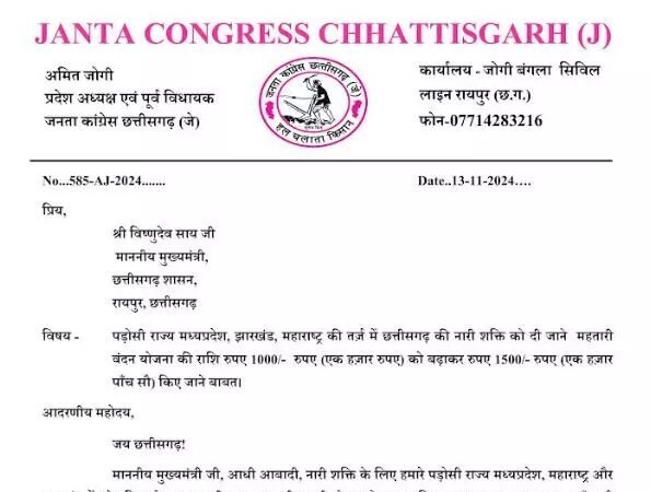 अमित जोगी ने अपने पत्र में कहा माननीय मुख्यमंत्री जी आधी आबादी, नारी शक्ति के लिए हमारे पड़ोसी राज्य मध्यप्रदेश, महाराष्ट्र और झारखंड में लोकप्रिय योजना लाड़ली बहन, लाड़ली लक्ष्मी योजना के तहत प्रतिमाह 1500/- रुपए (एक हज़ार पाँच सौ रुपए) प्रदान किया जाता है परंतु दुर्भाग्यवश छत्तीसगढ़ में हमारी बहनों को महतारी वंदन योजना के अंतर्गत प्रतिमाह केवल 1000/- रुपए (एक हज़ार रुपए) की राशि प्रतिमाह प्रदान किया जाता है जो कि छत्तीसगढ़ की आधी आबादी, छत्तीसगढ़ की नारी शक्ति और हमारी लाड़ली बहनों के साथ सौतेला व्यवहार और हमारी बहनों के साथ भेदभाव है । अमित जोगी ने मुख्यमंत्री श्री साय से छत्तीसगढ़ की पड़ोसी राज्य मध्यप्रदेश, महाराष्ट्र और झारखंड की तर्ज पर छत्तीसगढ़ की लाड़ली बहनों को महतारी वंदन योजना के अंतर्गत मिलने वाली राशि 1000/- रुपए (एक हज़ार रुपए) की राशि को बढ़ाकर 1500/- रुपए (एक हज़ार पाँच सौ रुपए) करने का आग्रह किया है।