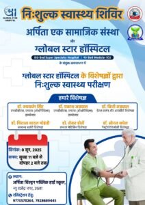 रायपुर। ARPITA HEALTH CAMP जनसेवा की भावना के साथ, अर्पिता सामाजिक संस्था और ग्लोबल स्टार हॉस्पिटल के विशेषज्ञ डॉक्टरों की टीम मिलकर 8 जून 2025 को निःशुल्क स्वास्थ्य परीक्षण शिविर का आयोजन करने जा रही है। इस शिविर का उद्देश्य आमजन तक स्वास्थ्य सेवाएं पहुँचाना और उन्हें प्राथमिक जांच एवं सलाह उपलब्ध कराना है।