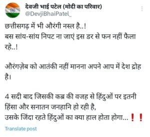 देवजी भाई पटेल ने ट्वीट कर कहा है कि, छत्तीसगढ़ में भी औरंगी नस्ल है..!