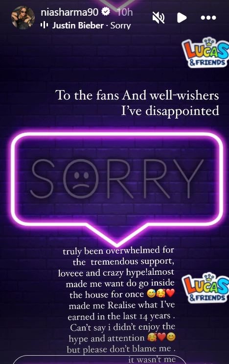 निया शर्मा बिग बॉस 18 का हिस्सा नहीं बनने वाली हैं। उन्होंने इंस्टाग्राम स्टोरी पर एक पोस्ट शेयर करते हुए शो में शामिल न होने की जानकारी दी है और फैंस को सॉरी बोला है। एक्ट्रेस ने स्टोरी में सॉरी लिखते हुए कहा, “फैंस और शुभचिंतको के लिए जिन्हें मैंने निराश किया है। सॉरी। निया शर्मा ने आगे लिखा, “मैं वाकई जबरदस्त सपोर्ट, प्यार और क्रेजी हाइप से अभिभूत हूं। इसने मुझे एक बार को घर के अंदर जाने के लिए मजबूर कर दिया और मुझे एहसास हुआ कि मैंने पिछले 14 सालों में क्या कमाया है। मैं यह नहीं कह सकती कि मुझे प्रचार और ध्यान पसंद नहीं आया, लेकिन कृपया मुझे दोष न दें। यह मैं नहीं थी।”