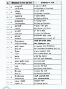 राजपाल सिंह शेखावत और नरपत सिंह राजवी का नाम पहली सूची में नहीं है. विद्याधर नगर (जयपुर) से विधायक नरपत सिंह राजवी की जगह सांसद दीया कुमारी को टिकट दिया गया है और झोटवाड़ा (जयपुर) से पूर्व मंत्री राजपाल सिंह शेखावत की जगह राज्यवर्धन सिंह राठौड़ को टिकट दिया गया है.
