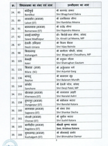 राजस्थान से सांसद राज्यवर्धन राठौड़ को झोटावाड़ा से टिकट मिला है. वहीं बाबा बालक नाथ जो कि तिजारा से सांसद हैं उन्हें भी राज्य के चुनावी मैदान में उतारा गया है. इसके अलावा सवाई माधोपुर से किरोड़ी लाल मीना, किशनगढ़ के सांसद भागीरथ चौधरी व सांचौर से सांसद श्री देवजी पटेल को पार्टी ने विधानसभा चुनावों में टिकट दिया है.