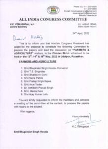 दरअसल, कांग्रेस उदयपुर में 13, 14 और 15 मई को राजस्थान के उदयपुर में किसानी और किसानों को लेकर चिंतन शिविर आयोजित करने जा रही है। तीन दिन चलने वाले इस शिविर के लिए हरियाणा के पूर्व मुख्यमंत्री भूपेंद्र सिंह हुड्डा को कमेटी का अध्यक्ष बनाया गया है। इस कमेटी में छत्तीसगढ़ के स्वास्थ्य मंत्री टीएस सिंहदेव को शामिल किया गया है।