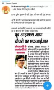 रायपुर। छत्तीसगढ़ में भाजपा नेता और पूर्व IAS ओपी चौधरी पर एफआईआर दर्ज होने के बाद भाजपा नेताओं ने सरकार पर जमकर हमला बोलना शुरू कर दिया है। पूर्व मुख्यमंत्री डॉ. रमन सिंह और पूर्व मंत्री अजय चंद्राकर ने सोशल मीडिया के जरिये आक्रामक प्रतिक्रिया दी है। डॉ. रमन ने ट्वीट कर कहा है कि और कितना गिरेंगे भूपेश बघेल। इतना दुर्बल मुख्यमंत्री नहीं देखा, जो सच नहीं देख सकता। डा. रमन ने कहा कि, ओपी चौधरी ने आपके लचर प्रशासन की खामियां उजागर की तो गैरजमानती धाराएं लगा दीं। इससे आगे डा. रमन ने लिखा है कि, हम डरने वाले नहीं हैं। सनद रहे, यह तानाशाही नहीं चलेगी, इंट से ईंट बजा देंगे कांग्रेस सरकार की।