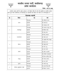 रायपुर। भारतीय जनता पार्टी ने युवा मोर्चा में बड़ा संगठनात्मक बदलाव करते हुए विभिन्न जिलों के जिला अध्यक्ष और जिला महामंत्रियों की नियुक्ति कर दी है। ये सभी नियुक्तियां तत्काल प्रभाव से लागू होंगी। प्रदेश भाजपा कार्यालय से जारी आदेश के मुताबिक, इसका मकसद संगठन को जमीनी स्तर पर मजबूत करना और युवाओं की भागीदारी को और बढ़ाना है।