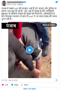 पूर्व केन्द्रीय राज्यमंत्री राज्यवर्धन सिंह राठौर ने वीडियो को अपने आधिकारिक ट्विटर अकाउंट पर शेयर करते हुए पंजाब की आम आदमी पार्टी की सरकार पर तीखा हमला बोला है। उन्होंने कहा, “पंजाब में जबसे AAP की सरकार आई है दंगे, हत्याएं और पुलिस पर हमला आम बात हो गई है। और अब तो पंजाब से ऐसे ‘तालिबानी हुकूमत’ के वीडियो रोजाना ही देखने को मिलते हैं। अतिवादियों से हाथ मिलाकर सरकार तो बना ली AAP ने, पर सजा पंजाब की जनता भुगत रही है।”