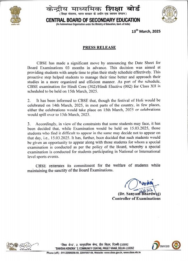 CBSE Holi Gift: देश के अधिकतर हिस्सों में होली का त्योहार 14 मार्च को मनाया जायेगा, लेकिन कुछ स्थानों पर 15 मार्च को भी उत्सव की संभावना है। इसे ध्यान में रखते हुए, जिन छात्रों को 15 मार्च को परीक्षा देने में कठिनाई होगी, उन्हें एक विशेष परीक्षा में शामिल होने का अवसर दिया जाएगा। – डॉ. संयम भारद्वाज, परीक्षा नियंत्रक, सीबीएसई