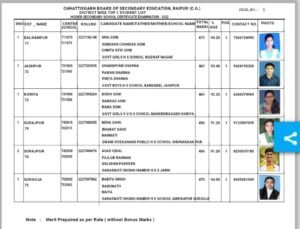छत्तीसगढ़ बोर्ड कक्षा 12वीं की परीक्षा में 2 लाख 92 हजार 611 परीक्षार्थी स्टूडेंट्स शामिल हुए थे। इस साल बोर्ड रिजल्ट पिछले साल की तुलना में 72 दिन पहले जारी किए गए हैं। छत्तीसगढ़ बोर्ड 12वीं की परीक्षा में प्रथम स्थान कुंती साव (98.20), दूसरा स्थान खुशबू वाधवानी ने (96.40) प्रतिशत, तीसरा स्थान रितेश कुमार साहू (95.60) प्रतिशत लाया गया हैं।