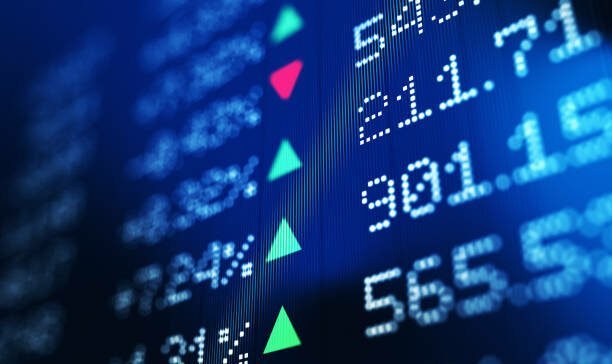 Financial data analysis graph showing stock market trends on a trading board. Horizontal composition with copy space and selective focus.