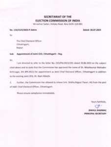 CG BREAKING : चुनाव आयोग में ज्वाइंट CEO की नियुक्ति, इस IAS अफसर को मिली जिम्मेदारी ..
