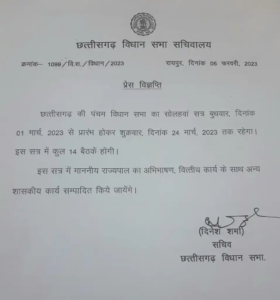 CG BREAKING: Budget session of Chhattisgarh Legislative Assembly will start from March 1, notification issued
