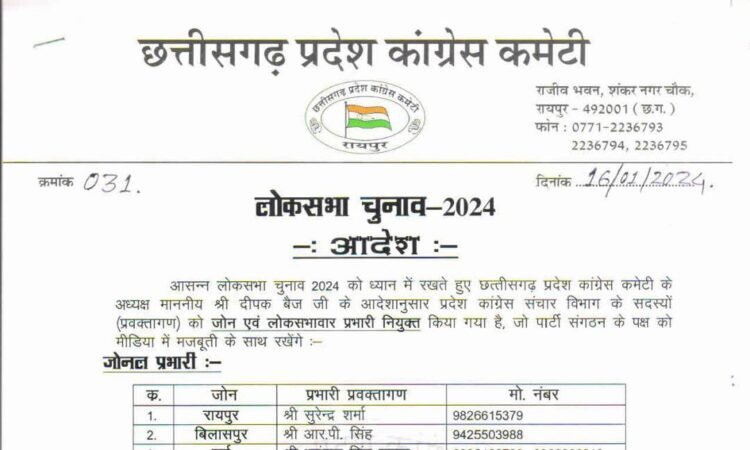 CG BREAKING : लोकसभा चुनाव 2024 के लिये कांग्रेस ने जोनल प्रभारी और लोकसभा प्रभारियों की नियुक्त आदेश की जारी
