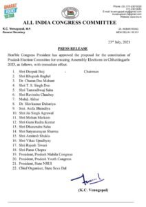 रायपुर। कांग्रेस अध्यक्ष ने छत्तीसगढ़ में आगामी विधानसभा चुनाव 2023 के लिए प्रदेश चुनाव समिति के गठन के प्रस्ताव को तत्कालप्रभाव से मंजूरी दे दी है।