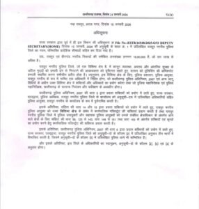 CG BREAKING NEWS: रायपुर | छत्तीसगढ़ की राजधानी रायपुर के लिए आज का दिन ऐतिहासिक है। राज्य शासन ने रायपुर नगर क्षेत्र में पुलिस कमिश्नरी प्रणाली (Police Commissionerate System) लागू करने की आधिकारिक अधिसूचना जारी कर दी है। यह नई व्यवस्था 23 जनवरी 2026 से प्रभावी होगी। लगभग 19 लाख की आबादी वाले शहर में बढ़ते अपराध, ट्रैफिक दबाव और शहरी चुनौतियों से निपटने के लिए यह बड़ा प्रशासनिक कदम उठाया गया है।