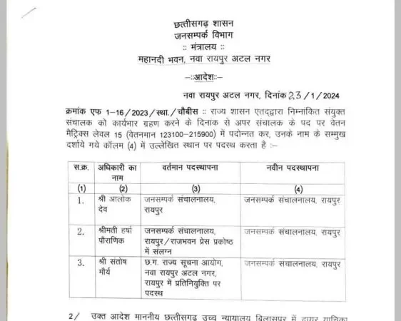 CG BREAKING : जनसंपर्क विभाग के अधिकारियों के पदोन्नति एवं नवीन पदस्थापना आदेश जारी