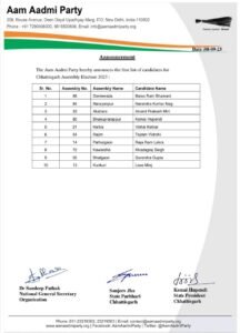 CG BREAKING: Ten candidates of Aam Aadmi Party declared