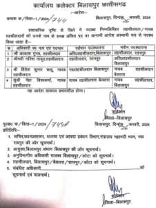 जारी आदेश के अनुसार, अतिरिक्त तहसीलदार बिलासपुर की जिम्मेदारी संभाल रहे आकाश गुप्ता को रतनपुर तहसीलदार बनाया गया है। वहीं गरीमा ठाकुर को बिलासपुर अतिरिक्त तहसीलदार की जिम्मेदारी दी गई है। इसके साथ ही हितेश कुमार साहू को बेलतरा नायब तहसीलदार और नेहा विश्वकर्मा को बिलासपुर नायब तहसीलदार बनाया गया है।