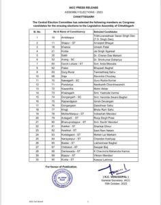 रायपुर। विधानसभा चुनाव के लिए कांग्रेस ने अपने उम्मीदवारों की पहली सूची जारी कर दी है। जारी सूची में पार्टी ने 30 उम्मीदवारों के नाम पर मुहर लगाई है। छत्तीसगढ़ कांग्रेस में छन्नी साहू सहित 6 विधायकों की टिकट कटी है। वहीं लोक स्वास्थ्य यान्त्रिकी एवं ग्रामोद्योग मंत्री गुरू रुद्र कुमार ने अपनी सीट बदल ली है। इस बार कांग्रेस ने भाजपा के खिलाफ अपनी पहली सूची में चार महिलाओं को चुनावी मैदान में उतारा है।