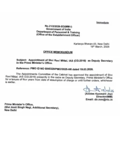 यह आदेश 19 मार्च 2026 को नई दिल्ली स्थित कर्तव्य पथ के कार्यालय से जारी किया गया है, जिसमें स्पष्ट किया गया है कि रवि मित्तल वर्तमान में अपने कैडर में सेवाएं दे रहे थे और अब उन्हें पीएमओ में तैनात किया गया है।