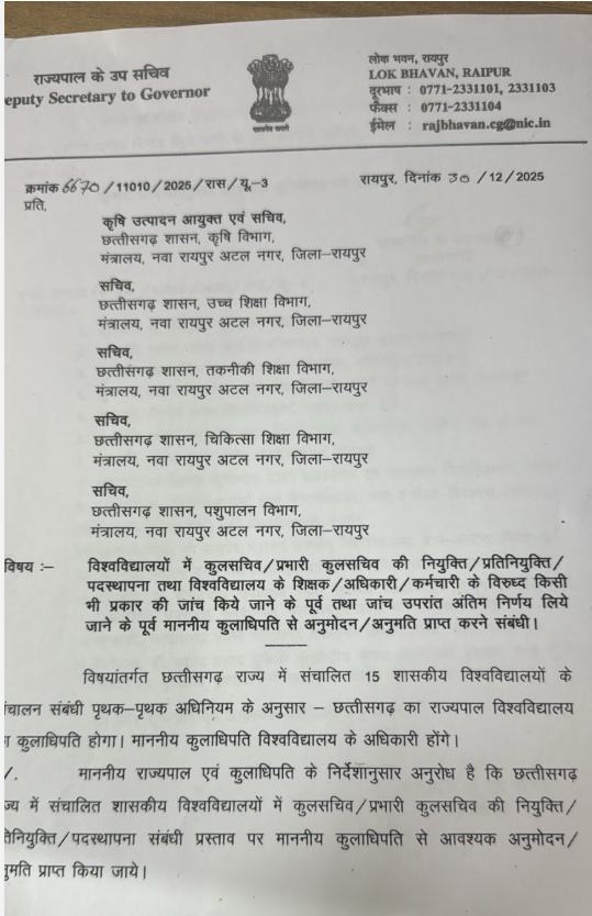 CG NEWS: रायपुर। छत्तीसगढ़ के सरकारी विश्वविद्यालयों में अब किसी भी अधिकारी, शिक्षक या कर्मचारी के खिलाफ जांच शुरू करने से पहले राज्यपाल से अनुमति लेनी होगी। जांच पूरी होने के बाद अंतिम निर्णय लेने के लिए भी कुलाधिपति की स्वीकृति जरूरी होगी। इस संबंध में लोकभवन से आदेश जारी किया गया है। बता दें कि इस आदेश के बाद छत्तीसगढ़ में राज्यपाल और राज्य सरकार के बीच अधिकारों को लेकर टकराव की स्थिति पैदा हो गई है।