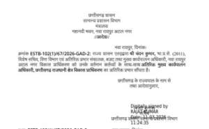रायपुर. रायपुर में राज्य सरकार ने प्रशासनिक स्तर पर आंशिक फेरबदल करते हुए दो अधिकारियों के प्रभार में बदलाव किया है। इस संबंध में General Administration Department Chhattisgarh ने अलग-अलग आदेश जारी किए हैं।