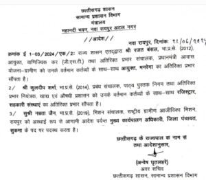 chhattisagrhTrending Now CG Transfer News : आचार सहिंता खत्म होते ही शुरू हुआ तबादलों का सिलसिला, तीन IAS अफसर का हुआ ट्रांसफर By: Jiya Choudhary Date: June 21, 2024 रायपुर। राज्य सरकार ने एक आईएएस अफसर का ट्रांसफर और दो अन्य को अतिरिक्त प्रभार सौंपा है। आदेश में आईएएस रजत बंसल और आईएएस कुलदीप शर्मा एवं नम्रता जैन का नाम शामिल है। TagsCG Transfer NewsThe process of transfers started as soon as the Code of Conduct endedthree IAS officers were transferred Previous articleअंतर्राष्ट्रीय योग दिवस के आयोजन के बाद साइंस कॉलेज मैदान में नगर निगम स्वास्थ्य विभाग ने सफाई करवाकर कायम की स्वच्छतNext articleCG BREAKING : 3 IAS अफसरों के प्रभार में बदलाव, देखें लिस्ट Jiya Choudharyhttp://www.khabarchalisa.com Share post: FacebookTwitterPinterestWhatsApp SubscribeI want inI've read and accept the Privacy Policy. #Crime Updates TEJI KAHLON SHOT : कनाडा में पंजाबी सिंगर तेजी कहलों पर फायरिंग, रोहित गोदारा गैंग ने ली जिम्मेदारी AKIL AKHTAR DEATH CASE : पूर्व DGP मुस्तफा के बेटे की रहस्यमय मौत ने खोले पारिवारिक रिश्तों के राज CG FRAUD CASE : मेडिकल व्यवसायी से 73 लाख और यूट्यूब निवेश ठगी में 12.79 लाख की चपत CG MINOR GIRL KILLES LOVER : लॉज में नाबालिग प्रेमिका ने की प्रेमी मोहम्मद सद्दाम की हत्या दिल दहला देने वाला मामला: मां ने जन्म देने के तुरंत बाद नवजात का घोंटा गला, शव कूड़े में फेंक हो गई फरार More like thisRelated CG CRIME NEWS: ग्राम कुम्हरता में पति-पत्नी की संदिग्ध हालात में मौत, पुलिस ने मामला दर्ज कर शुरू की जांच Jiya Choudhary - 20 minutes ago CG CRIME NEWS: सरगुजा। दरिमा थाना क्षेत्र के ग्राम... BREAKING: आईपीएस रतनलाल डांगी पर यौन उत्पीड़न के आरोप, आईपीएस आनंद छाबड़ा और मिलना कुर्रे करेंगे जांच Jiya Choudhary - 30 minutes ago BREAKING: नई दिल्ली। आईपीएस रतनलाल डांगी के खिलाफ एक... दिल्ली से पटना जा रही स्पाइसजेट की फ्लाइट वापस लौटी, मचा हड़कंप Jiya Choudhary - 2 hours ago नई दिल्ली। गुरुवार को दिल्ली से पटना जा रही... BIHAR CHUNAV: महागठबंधन का बड़ा ऐलान… तेजस्वी यादव होंगे CM पद के उम्मीदवार, मुकेश सहनी उप मुख्यमंत्री चेहरे के रूप में उतरेंगे मैदान में Jiya Choudhary - 2 hours ago BIHAR CHUNAV: पटना। बिहार की राजनीति में लंबे इंतजार...