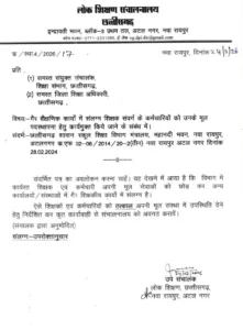 रायपुर, 25 फरवरी 2026। लोक शिक्षण संचालनालय छत्तीसगढ़ (डीपीआई) ने गैर शैक्षणिक कार्यों में संलग्न शिक्षक संवर्ग के कर्मचारियों को लेकर सख्त निर्देश जारी किए हैं। संचालनालय ने सभी संयुक्त संचालक शिक्षा संभाग और जिला शिक्षा अधिकारियों को पत्र भेजकर ऐसे शिक्षकों का संलग्नीकरण तत्काल प्रभाव से समाप्त करने और उन्हें उनकी मूल पदस्थापना शालाओं में वापस भेजने को कहा है।