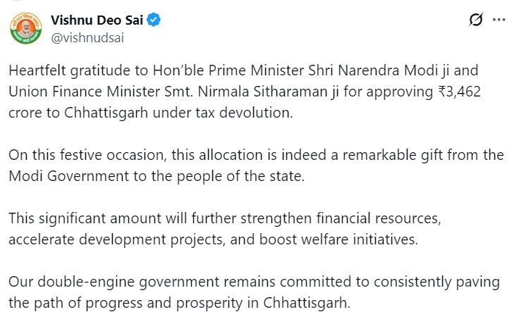 रायपुर, 2 अक्टूबर 2025। मुख्यमंत्री विष्णु देव साय ने प्रधानमंत्री नरेंद्र मोदी और केंद्रीय वित्त मंत्री निर्मला सीतारमण का धन्यवाद करते हुए कहा कि छत्तीसगढ़ को टैक्स डिवल्यूशन के तहत 3,462 करोड़ रुपये की मंजूरी दी गई है। इस राशि को राज्य के विकास परियोजनाओं को गति देने और कल्याण योजनाओं को सुदृढ़ करने के लिए उपयोग किया जाएगा।