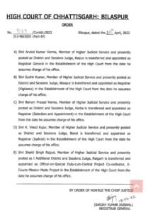 बिलासपुर। हाईकोर्ट के रजिस्ट्रार जनरल ने हायर ज्यूडिशियल सर्विस के चार न्यायाधीशों की नई जिम्मेदारियां तय की हैं। इसके अंतर्गत रायपुर में पदस्थ डिस्ट्रिक्ट एंड सेसंस जज अरिवंद कुमार वर्मा को हाईकोर्ट स्थापना का रजिस्ट्रार जनरल बनाया गया है। इसी तरह सुधीर कुमार को रजिस्ट्रार विजिलेंस की जिम्मेदारी दी गई है। वे फिलहाल बिलासपुर के डिस्ट्रिक्ट एंड सेसंस जज हैं। इसी तरह कोरबा के डिस्ट्रिक्ट एंड सेसंस जज बलराम प्रसाद वर्मा को रजिस्ट्रार सेलेक्शन एंड अपॉइंटमेंट की जिम्मेदारी दी गई है। बालोद के डिस्ट्रिक्ट एंड सेसंस जज के. विनोद कुजूर रजिस्ट्रार ज्यूडिशियल बनाए गए हैं। इसी तरह रायगढ़ में पदस्थ एडीजे शक्ति सिंह राजपूत ई-कोर्ट मिशन के ओएसडी बनाए गए हैं।