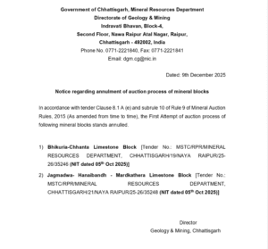 रायपुर। रायपुर-खैरागढ़ जिले से बड़ी प्रशासनिक खबर सामने आई है। छुईखदान विकासखंड के अंतर्गत आने वाले जगमड़वा–हनाईबन–मरदकठेरा चूना पत्थर ब्लॉक को निरस्त कर दिया गया है। यह खनिज ब्लॉक करीब 304.209 हेक्टेयर क्षेत्र में फैला हुआ था और इलाके का दूसरा सबसे बड़ा खनिज ब्लॉक माना जाता था।