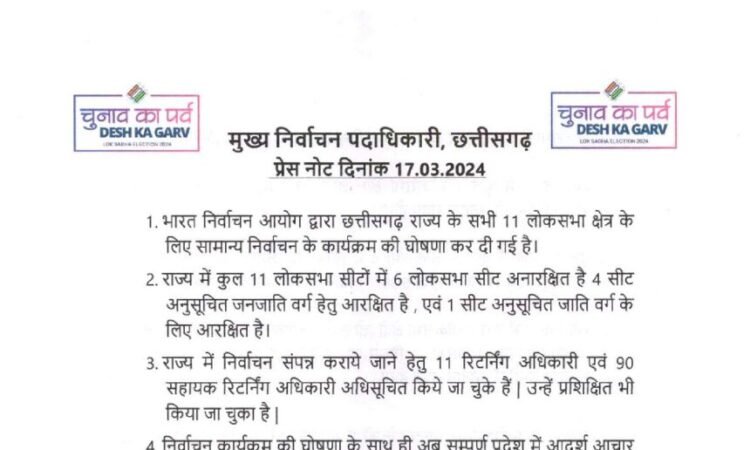 इसी बीच आज राजधानी रायपुर में मुख्य निर्वाचन पदाधिकारी रीना कंगाले ने रायपुर में प्रेस कांफ्रेंस को संबोधित किया। इस दौरान उन्होंने लोकसभा चुनाव की तैयारियों को मिडिया से साझा किया।