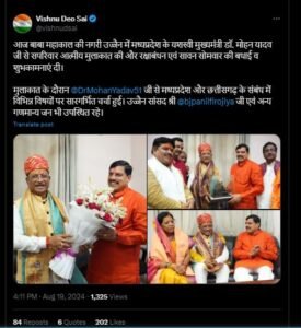 उज्जैन। छत्तीसगढ़ के मुख्यमंत्री विष्णुदेव साय ने आज बाबा महाकाल की नगरी उज्जैन में मध्यप्रदेश के मुख्यमंत्री डॉ. मोहन यादव से सपरिवार आत्मीय मुलाकात की. सीएम साय ने इस अवसर पर डॉ. मोहन यादव को रक्षाबंधन पर्व और सावन सोमवार की शुभकामनाएं भी दीं. सीएम ने सोशल मीडिया प्लेटफॉर्म ‘एक्स’ पर इस मुलाकात की तस्वीर साझा की है.