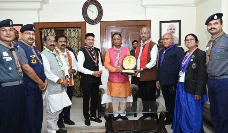मुख्यमंत्री विष्णुदेव साय को स्काउट्स एवं गाइड्स के सदस्यों ने संरक्षक बैज पहनाकर किया अलंकृत