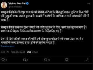 मामले को लेकर CM साय ने दुःख जताया है X में सीएम ने कहा, सरगुजा जिले के सीतापुर थाना क्षेत्र में बोलेरो-कंटेनर के बीच हुई सड़क दुर्घटना में 4 लोगों की मृत्यु की खबर अत्यंत दुःखद है। हादसे में 6 लोगों के आंशिक रूप से घायल होने की भी खबर है।