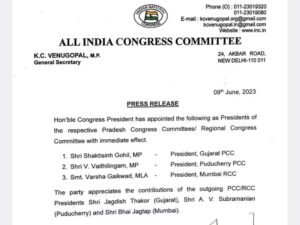 नई दिल्ली। शक्ति सिंह गोहिल को कांग्रेस की गुजरात इकाई का अध्यक्ष नियुक्त किया गया है. कांग्रेस नेता दीपक बावरिया को दिल्ली कांग्रेस और हरियाणा कांग्रेस का प्रभारी बनाया गया है. वहीं कांग्रेस ने वी वैथीलिंगम को पुडुचेरी इकाई और वर्षा गायकवाड को मुंबई इकाई का अध्यक्ष नियुक्त किया है.
