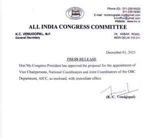 नई दिल्ली, 1 दिसंबर 2025. भारतीय राष्ट्रीय कांग्रेस (INC) ने ओबीसी विभाग में महत्वपूर्ण नियुक्तियाँ की हैं। कांग्रेस अध्यक्ष की मंजूरी के बाद, राष्ट्रीय उपाध्यक्ष (Vice Chairpersons), राष्ट्रीय समन्वयक (National Coordinators) और संयुक्त समन्वयक (Joint Coordinators) की नई सूची तुरंत प्रभाव से लागू कर दी गई है।