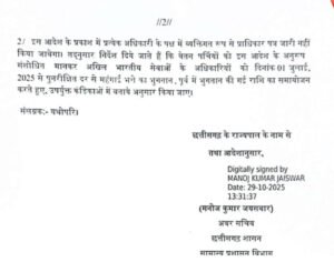 अवर सचिव (सामान्य प्रशासन विभाग) मनोज जयसवार द्वारा 29 अक्टूबर को जारी आदेश के अनुसार, 1 जुलाई 2025 से इन अफसरों को 58% महंगाई भत्ता दिया जाएगा। भुगतान केंद्रीय वित्त विभाग की निर्धारित प्रक्रिया के अनुसार नकद रूप में किया जाएगा।