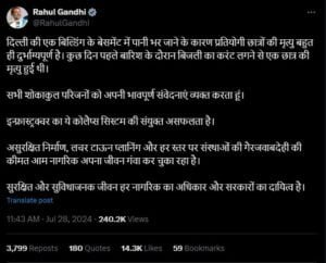 तीन छात्रों की मौत पर राहुल गांधी ने कहा, ‘दिल्ली की एक बिल्डिंग के बेसमेंट में पानी भर जाने के कारण प्रतियोगी छात्रों की मृत्यु बहुत ही दुर्भाग्यपूर्ण है। कुछ दिन पहले बारिश के दौरान बिजली का करंट लगने से एक छात्र की मृत्यु हुई थी। सभी शोकाकुल परिजनों को अपनी भावपूर्ण संवेदनाएं व्यक्त करता हूं।