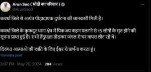 कवर्धा। डिप्टी सीएम अरुण साव ने 15 लोगों की मौत पर दुःख जताया है। X पर लिखा, कवर्धा जिले से अत्यंत पीड़ादायक दुर्घटना की जानकारी मिली है। कवर्धा जिले के कुकदूर थाना क्षेत्र में पिकअप वाहन पलटने से 15 लोगों के मृत होने की सूचना प्राप्त हुई है। सभी तेंदूपत्ता तोड़कर जंगल से घर वापस लौट रहे थे। दिवंगत आत्माओं की शांति के लिए ईश्वर से प्रार्थना करता हूं।