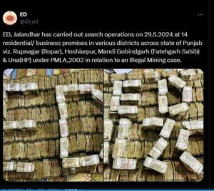 पंजाब। ईडी ने अवैध खनन मामले के संबंध में पीएमएलए, 2002 के तहत पंजाब राज्य के विभिन्न जिलों अर्थात रूपनगर (रोपड़), होशियारपुर, मंडी गोबिंदगढ़ (फतेहगढ़ साहिब) और ऊना (एचपी) में 29.5.2024 को 14 आवासीय/व्यावसायिक परिसरों में तलाशी अभियान चलाया। तलाशी अभियान के दौरान, विभिन्न आपत्तिजनक साक्ष्य, दस्तावेज, मोबाइल फोन, लैपटॉप और 4.06 करोड़ रुपये की नकदी बरामद की गई और जब्त की गई। यह जमीन ड्रग स्मगलिंग से जुड़े जगदीश सिंह उर्फ भोला के मनी लॉन्ड्रिंग की जांच के दौरान सामने आई थी, जिसके बाद यह कार्रवाई की गई। जानकारी के अनुसार इस कथित अवैध खनन मामले के कुछ आरोपियों में नसीबचंद और ‘श्री राम क्रशर’ शामिल हैं।