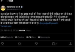 Hathras Accident : उत्तर प्रदेश के हाथरस बहुत ही भीषण हादसा है। इस हादसे में अब तक 107 लोगों की मौत हो चुकी है। इस उन्होंने ट्वीट कर कहा कि उत्तर प्रदेश के हाथरस में हुए दुखद हादसे को लेकर मुख्यमंत्री योगी आदित्यनाथ से बात की। यूपी सरकार सभी पीड़ितों की हरसंभव सहायता में जुटी हुई है। मेरी संवेदनाएं उन लोगों के साथ हैं, जिन्होंने इसमें अपने प्रियजनों को खोया है। इसके साथ ही मैं सभी घायलों के जल्द से जल्द स्वस्थ होने की कामना करता हूं।