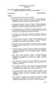 तेलंगाना। तेलंगाना सरकार ने 20 आईएएस अधिकारियों का स्थानांतरण और पदस्थापन कर शनिवार को जिलाधिकारियों में फेरबदल किया। पिछले साल दिसंबर में राज्य में कांग्रेस के सत्ता में आने के बाद यह जिलाधिकारियों में पहला बड़ा फेरबदल है।