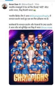 भाजपा प्रदेश अध्यक्ष अरुण साव ने X (पूर्व में ट्विटर) पर भारतीय टीम को बधाई देते हुए लिखा, “भारतीय रणबांकुरों ने देश को फिर दिलाई ‘मोटी’ जीत! अजेय भारत, विश्व विजयी भारत!”