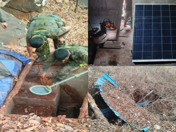 BIJAPUR NAXAL BUNKER FOUND : A huge Naxalite dump found in the hills, solar panels, uniforms and explosives recovered from the tunnel-like bunker