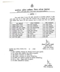 एसपी सिद्धार्थ तिवारी द्वारा जारी आदेश के अनुसार कुसमुंडा थाना प्रभारी युवराज तिवारी को बालको थाना का नया प्रभारी बनाया गया है। वहीं हरदीबाजार थाना प्रभारी मृत्युंजय पांडेय को कुसमुंडा थाना की जिम्मेदारी सौंपी गई है।