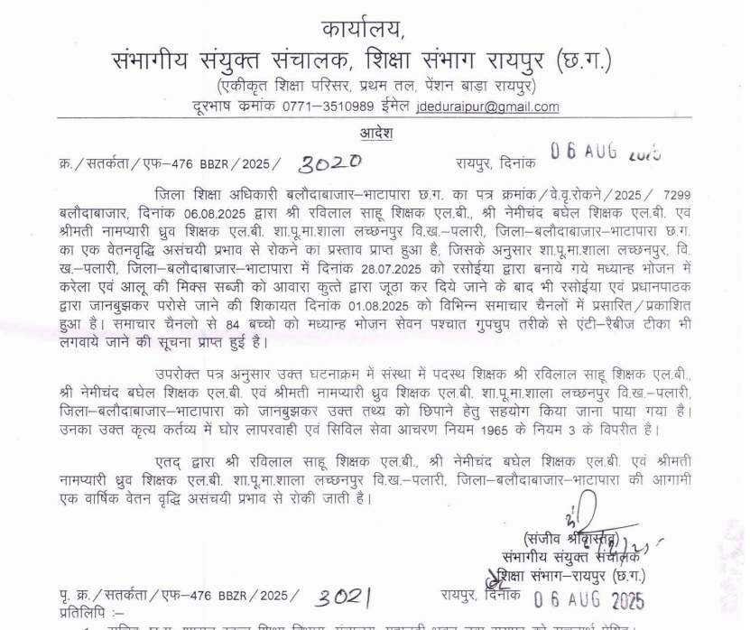 कर्तव्य में घोर लापरवाही एवं सिविल सेवा आचरण नियम 1965 के नियम 3 (1),(2),(3) एवं 3 (2) के उल्लंघन पर संचालक लोक शिक्षण छत्तीसगढ़ ने प्रभारी प्रधानपाठक नेतराम गिरि एवं शिक्षक एलबी वेदप्रकाश पटेल को तत्काल प्रभाव से निलंबित कर दिया। निलंबन अवधि में प्रधानपाठक नेतराम गिरि व शिक्षक वेदप्रकाश पटेल का मुख्यालय विकासखण्ड शिक्षा अधिकारी कार्यालय सिमगा नियत किया गया है। निलंबन अवधि में नियमानुसार जीवन निर्वाह भत्ता भत्ते की पात्रता होगी।