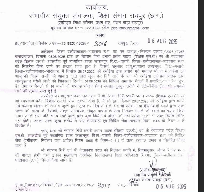 बता दें कि 28 जुलाई को रसोइयों द्वारा बनाए गए मध्यान्ह भोजन को आवारा कुत्ते द्वारा जूठा कर दिए जाने के बाद भी रसोइया एवं प्रधानपाठक ने जानबूझकर छात्रों को परोस दिया था और मामले को छुपाने का प्रयास किया था। इस दौरान 84 बच्चों को मध्यान्ह भोजन सेवन पश्चात् गुपचुप तरीके से एंटी रेबीज टीका लगवाए जाने एवं घटना को दबाने के प्रयास के संबंध में कलेक्टर बलौदाबाजार -भाटापारा के प्रतिवेदन के आधार पर शासकीय उच्चत्तर माध्यमिक विद्यालय लच्छनपुर के प्रभारी प्रधानपाठक नेतराम गिरि एवं शिक्षक एलबी वेदप्रकाश पटेल को प्रथम दृष्टया दोषी पाया गया।